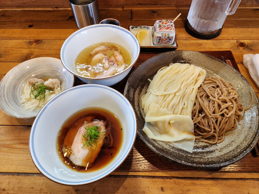 3種類の麺はどれもおいしく、特に黒いほうの麺は食感、風味がとてもよく好みでした。つけ汁は塩、醤油ともにチャーシューが入っており、値段に見合うどころかコスパいいのでは?と思えるほど。塩は麺の良さを引き出しつつ、スープ単体でもしっかり主張があり最高。しかし、さらに最高なのは醤油で、出汁が効きつつ脳に響くほどのキレがあり抜群でした!