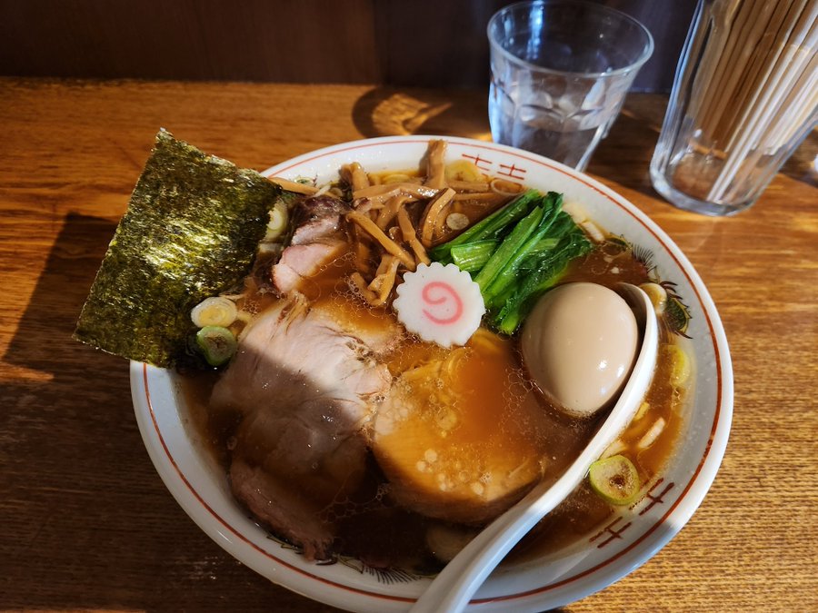 メニューは煮干し中華そばもありましたが、生姜醤油が好きなのでそちらに。ガツンと生姜を効かせる生姜醤油も好きですが、本店はじんわり生姜が染みる感じ。麺はツルツル、モチモチの食感でとても美味しかったです。肉増しメニューではないですが、チャーシューは4つ乗っており、味玉つけても1200円は立地を考えると高コスパと言えるのではないでしょうか。