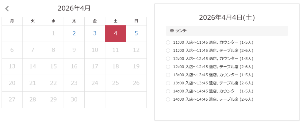 予約開始時間外は以下の表示になっているかと思います。キャンセルポリシーや臨時休業日を確認しつつ、予約日・予約時間を確定させておきましょう。また、飯田商店さんの場合は特にですが、倍率が高すぎて、平日・休日限らず狙った日時に予約できないことも多いです。第一候補、第二候補が決められるなら、先に決めておくといいと思います。