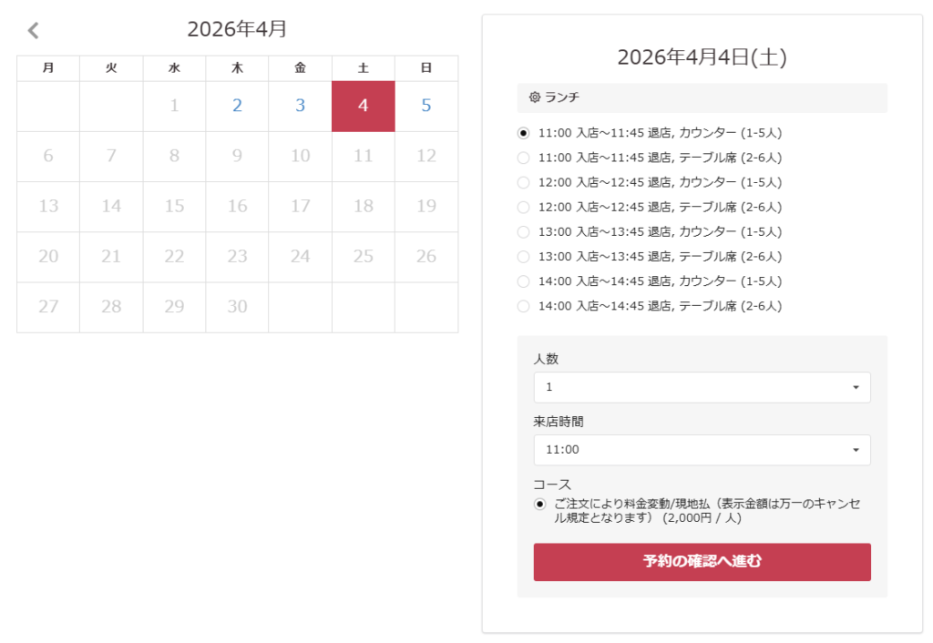 時間・人数を選択すると、予約の確認へ進むボタンが表示されますので押します。