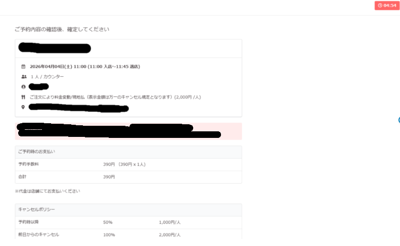 OMAKASEはTableCheckと同じように、日にち・時間の指定が可能です。また、TableCheck同様に予約時に予約手数料(390円)がかかり、キャンセルしようと予約手数料は返金されません。また、キャンセル時にはキャンセルポリシーに沿ったキャンセル料金も自動徴収されます